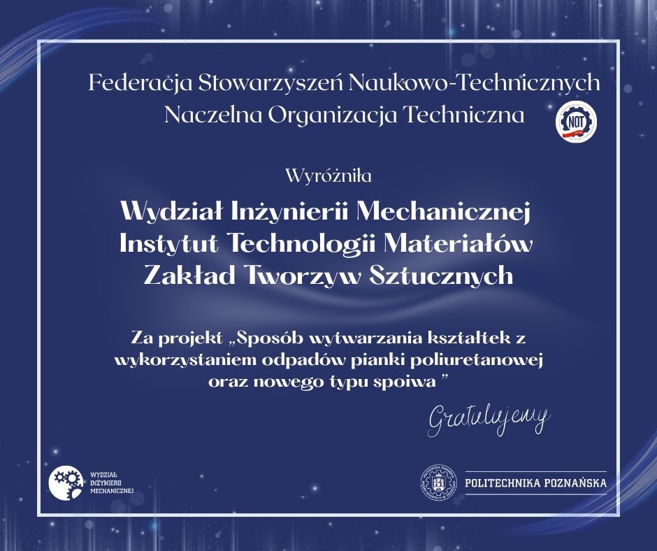 Nagrod臋 odebrali podczas gali, kt贸ra odby艂a si臋 na Akademii G贸rniczo-Hutniczej im. Stanis艂awa Staszica w Krakowie wraz z dr hab. in偶. Paw艂em Popielarskim, prof. PP, Dyrektorem Instytutu Technologii Materia艂贸w, kt贸ry r贸wnie偶 reprezentowa艂 Wydzia艂 In偶ynierii Mechanicznej.