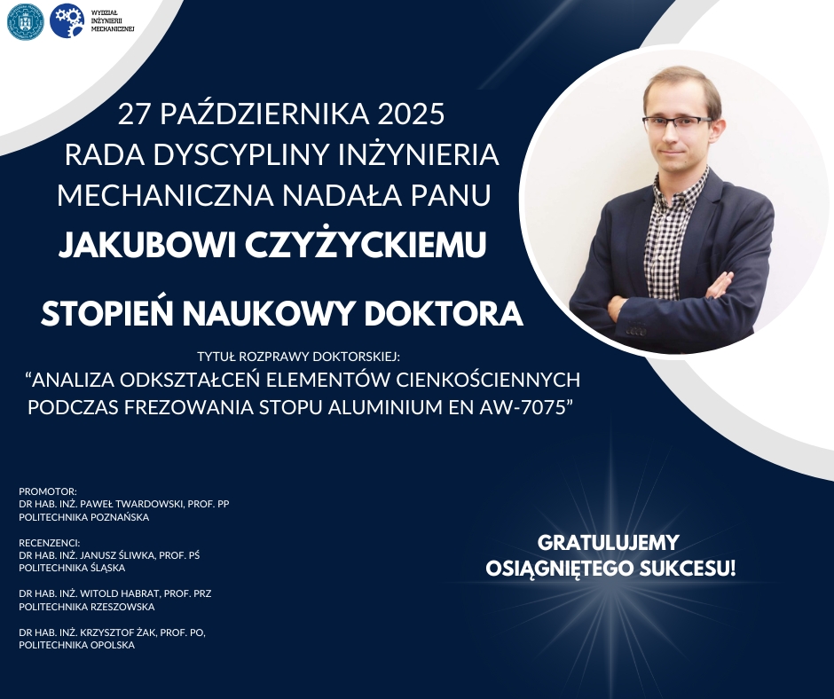 Data dodania 07.11.2025 Udostępnij: dr inż. Jakub Czyżycki 27 października 2025 r. Rada Dyscypliny Inżynieria Mechaniczna nadała Panu Jakubowi Czyżyckiemu stopień naukowy doktora. Serdecznie gratulujemy!!! Language PL