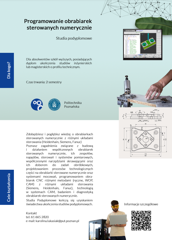 Rekrutacja trwa od 03.06.2024 - 30.09.2024Informacje odnośnie studiów podyplomowych - Programowanie obrabiarek sterowanych numerycznie | |